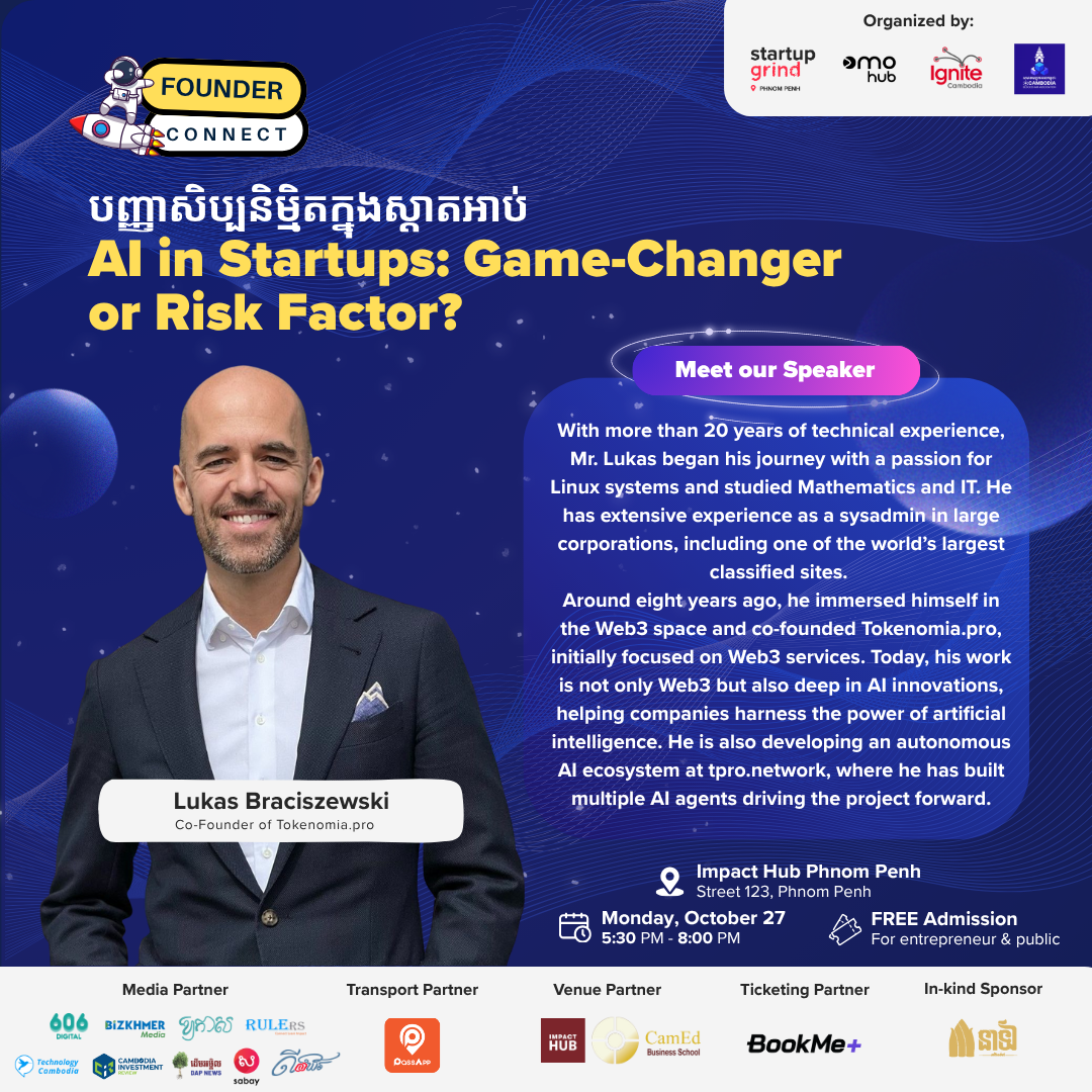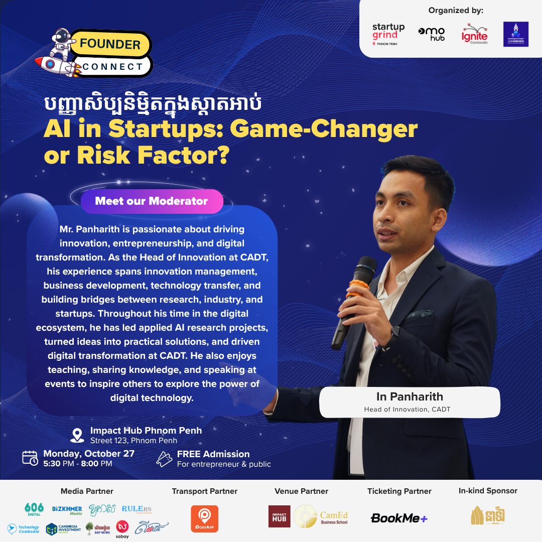 ភ្នំពេញ – Startup Grind Cambodia មានសេចក្តីសោមនស្សរីករាយក្នុងការរៀបចំកម្មវិធី Founder Connect នាពេលខាងមុខនេះក្រោមប្រធានបទ “AI in Startups: Game-Changer or Risk Factor?” ដែលនឹងប្រព្រឹត្តទៅនៅថ្ងៃច័ន្ទ ទី 27 ខែតុលា ឆ្នាំ 2025 ពីម៉ោង 5:30 PM ដល់ 8:00 PM នៅ Impact Hub Phnom Penh។